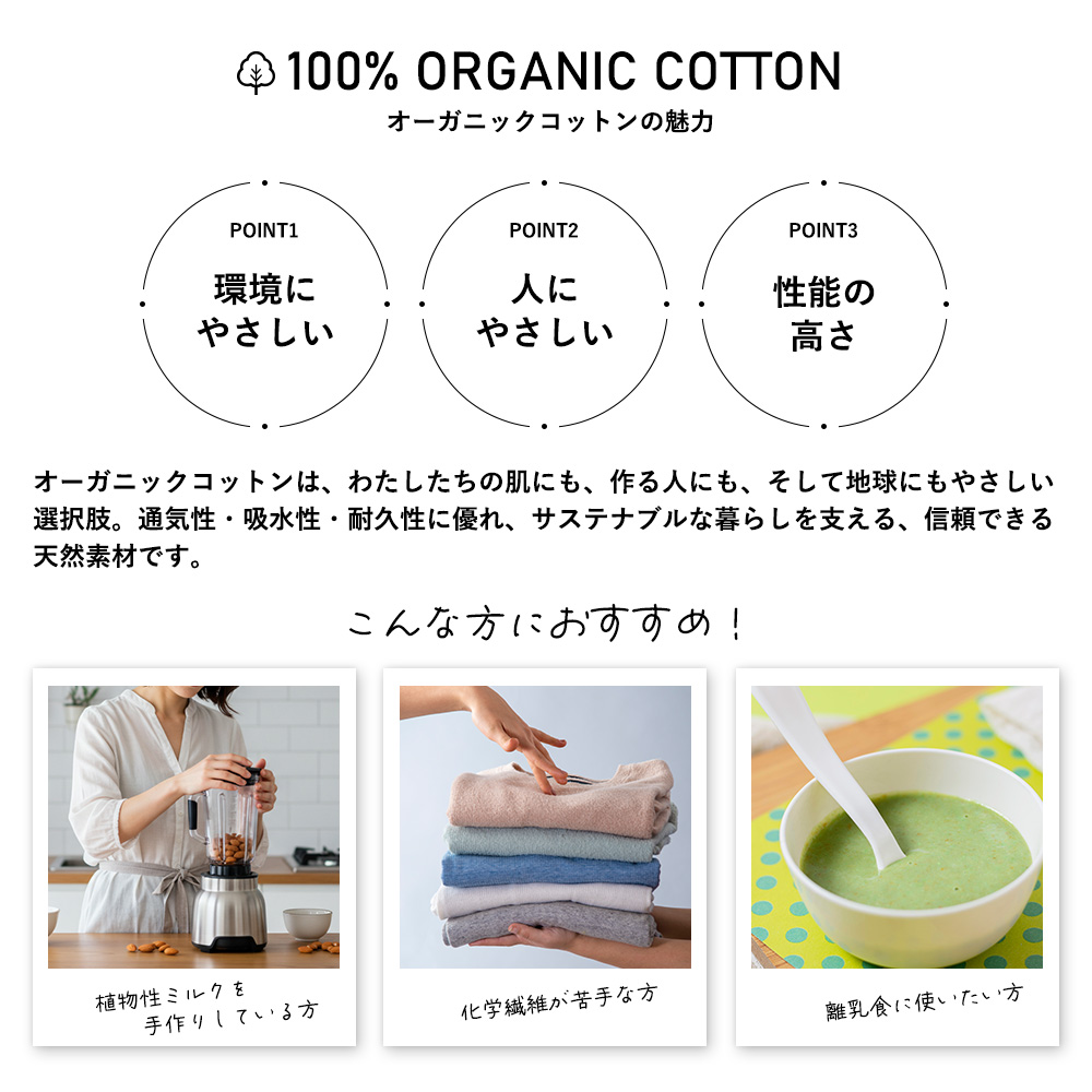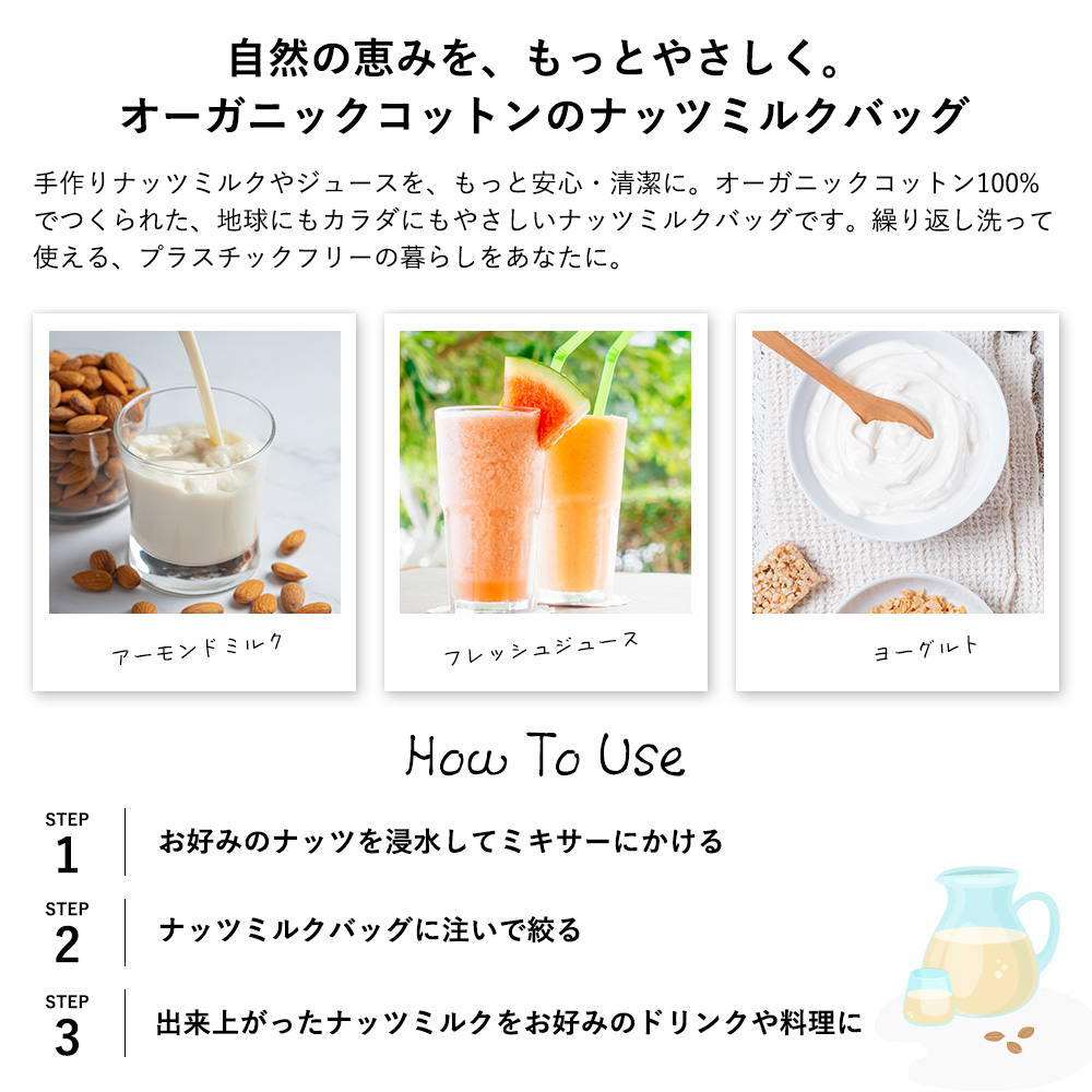 オーガニックコットン100%でつくられた、地球にもカラダにもやさしいナッツミルクバッグです。