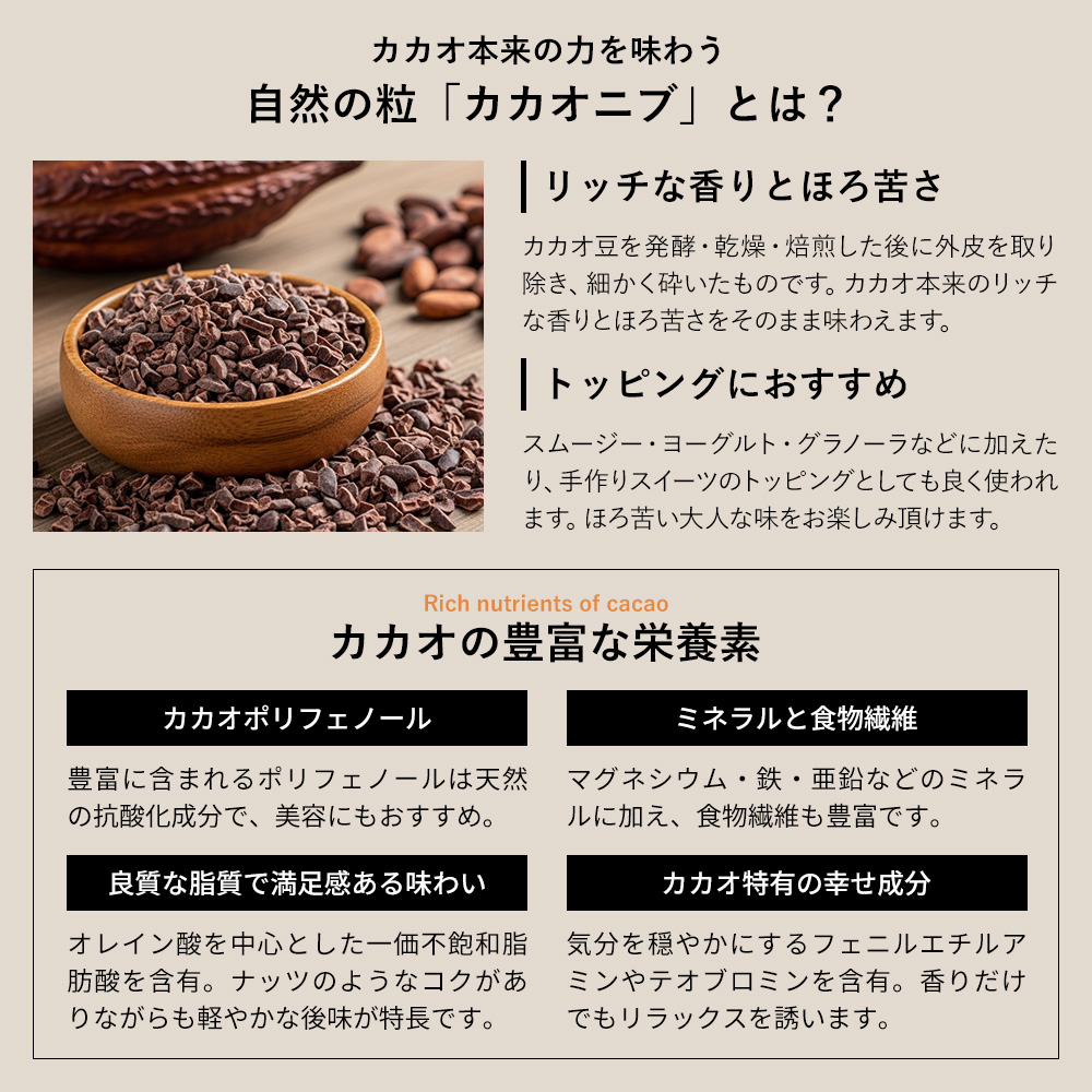 カカオニブは、カカオ豆を発酵・乾燥・焙煎した後に外皮を取り除き、細かく砕いた自然食品です。 砂糖や添加物を一切加えず、カカオ本来のリッチな香りとほろ苦さをそのまま味わえる、まさに“チョコレートの源”ともいえる素材です。