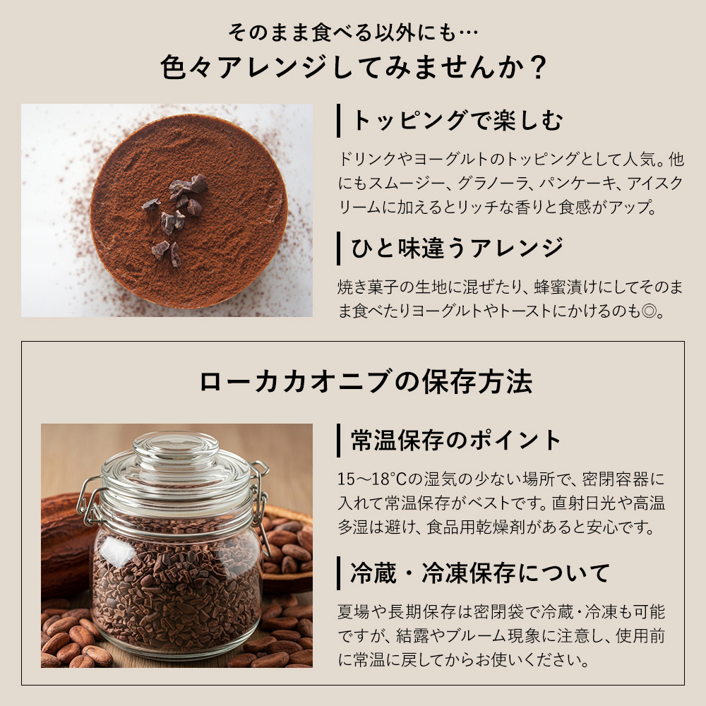 カカオニブは、スムージー・ヨーグルト・グラノーラなどに加えて楽しむ方が増えています。 また手作りのスイーツのトッピングとしても良く使われます。 パラっとひとさじ加えるだけで、ほろ苦い大人な味をお楽しみ頂けます。